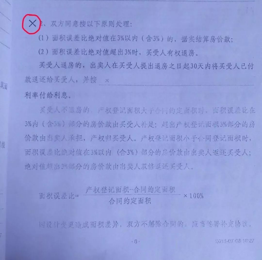 到底是不是售楼员迫于尾房销售压力,故意隐瞒房屋信息,我们已经无法考证。但是现在,对于房屋面积误差的争议,路先生认为房地产开发商应该按照购房合同之约定,超过3%的面积由开发商承担。但是记者仔细阅读合同却发现,这一条有利于购房者的规定,被开发商在前面打上了一个“叉”,意思就是这一条规定是被删除的,而在另一条有利于开发商的条款“面积误差多退少补”前面打了“对勾”。